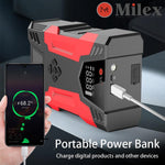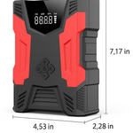 Portable jump starter with 3000 peak amps Ideal for up to 7.0L gas/5.0L diesel engines Perfect cars, RVs, motorcycles, lawnmowers, SUV, snowmobiles and boats 150 PSI air compressor with built-in for quickly inflating tires and inflatables Built-in air hose and auto stop technology when desired pressure is reached Real-time digital display of pressure 3-mode LED light and LCD display 10000mAh power bank with QC3.0 fast charging and USB output ports for charging cell phones and other devices Reverse charge, short circuit, over temperature, over charge and over-discharge protection 3 different inflation needles included Package Contents: