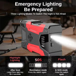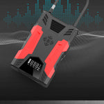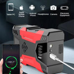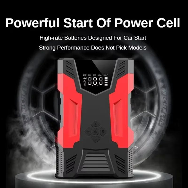 Portable jump starter with 3000 peak amps Ideal for up to 7.0L gas/5.0L diesel engines Perfect cars, RVs, motorcycles, lawnmowers, SUV, snowmobiles and boats 150 PSI air compressor with built-in for quickly inflating tires and inflatables Built-in air hose and auto stop technology when desired pressure is reached Real-time digital display of pressure 3-mode LED light and LCD display 10000mAh power bank with QC3.0 fast charging and USB output ports for charging cell phones and other devices Reverse charge, short circuit, over temperature, over charge and over-discharge protection 3 different inflation needles included